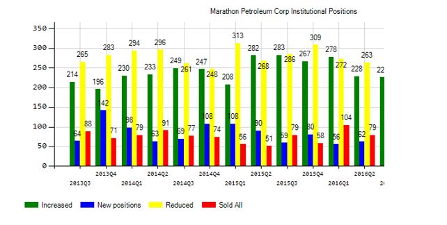 Investors sentiment increased to 1.24 in 2018 Q3. Its up 0.30, from 0.94 in 2018Q2. It increased, as 34 investors sold MPC shares while 306 reduced holdings. 131 funds opened positions while 289 raised stakes. 385.13 million shares or 7.58% more from 358.01 million shares in 2018Q2 were reported. Prudential Public Ltd Com invested in 0% or 6,354 shares. 13,159 are owned by Assetmark. Reaves W H And holds 0.61% in Marathon Petroleum Corporation (NYSE:MPC) or 235,106 shares. Apg Asset Management Nv has 0.45% invested in Marathon Petroleum Corporation (NYSE:MPC). Goodwin Daniel L reported 22,600 shares. Washington Bank & Trust holds 4,879 shares or 0.06% of its portfolio. 1St Source Bancorp accumulated 5,886 shares or 0.04% of the stock. Australia-based Amp Cap Ltd has invested 0.16% in Marathon Petroleum Corporation (NYSE:MPC). Gemmer Asset Mgmt Limited Liability reported 805 shares. Moreover, Usa Financial Portformulas has 0.7% invested in Marathon Petroleum Corporation (NYSE:MPC). Moreover, Point72 Asset Mngmt Lp has 1.22% invested in Marathon Petroleum Corporation (NYSE:MPC) for 3.71M shares. Jnba Financial holds 185 shares or 0.01% of its portfolio. 21,811 were accumulated by Zacks Mngmt. Synovus Finance Corp has invested 0.03% in Marathon Petroleum Corporation (NYSE:MPC). Shine Invest Advisory accumulated 1,631 shares or 0.07% of the stock.